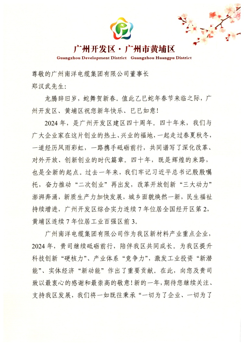 1月25日,值此乙巳蛇年春節來臨之際,廣州開發區、黃埔區領導向我司發來節日慰問信,向鄭漢武董事長及我司致以節日的祝福!