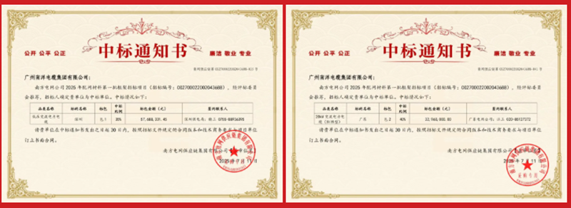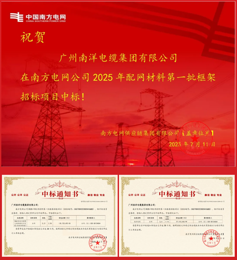 盛夏七月,驕陽似火,在這個充滿奮進與希望的季節,南方電網公司發布了2025年主網線路、配網材料第一批框架招標項目中標通知書,祝賀廣州南洋電纜集團有限公司繼續成為南方電網公司主、配網材料框招項目雙中標供應商!中標金額4.3億元!