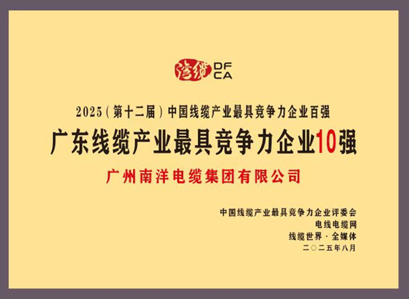 會上發布了由“電線電纜網”和“線纜世界·全媒體”聯合主辦中國線纜產業最具競爭力企業評測工作結果,廣州南洋電纜集團有限公司再次榮獲“2025年中國線纜產業最具競爭力企業20強”稱號!位列廣東線纜產業榜首!連續8年蟬聯中國線纜產業20強!連續8年蟬聯廣東線纜產業最具競爭力企業第一名!